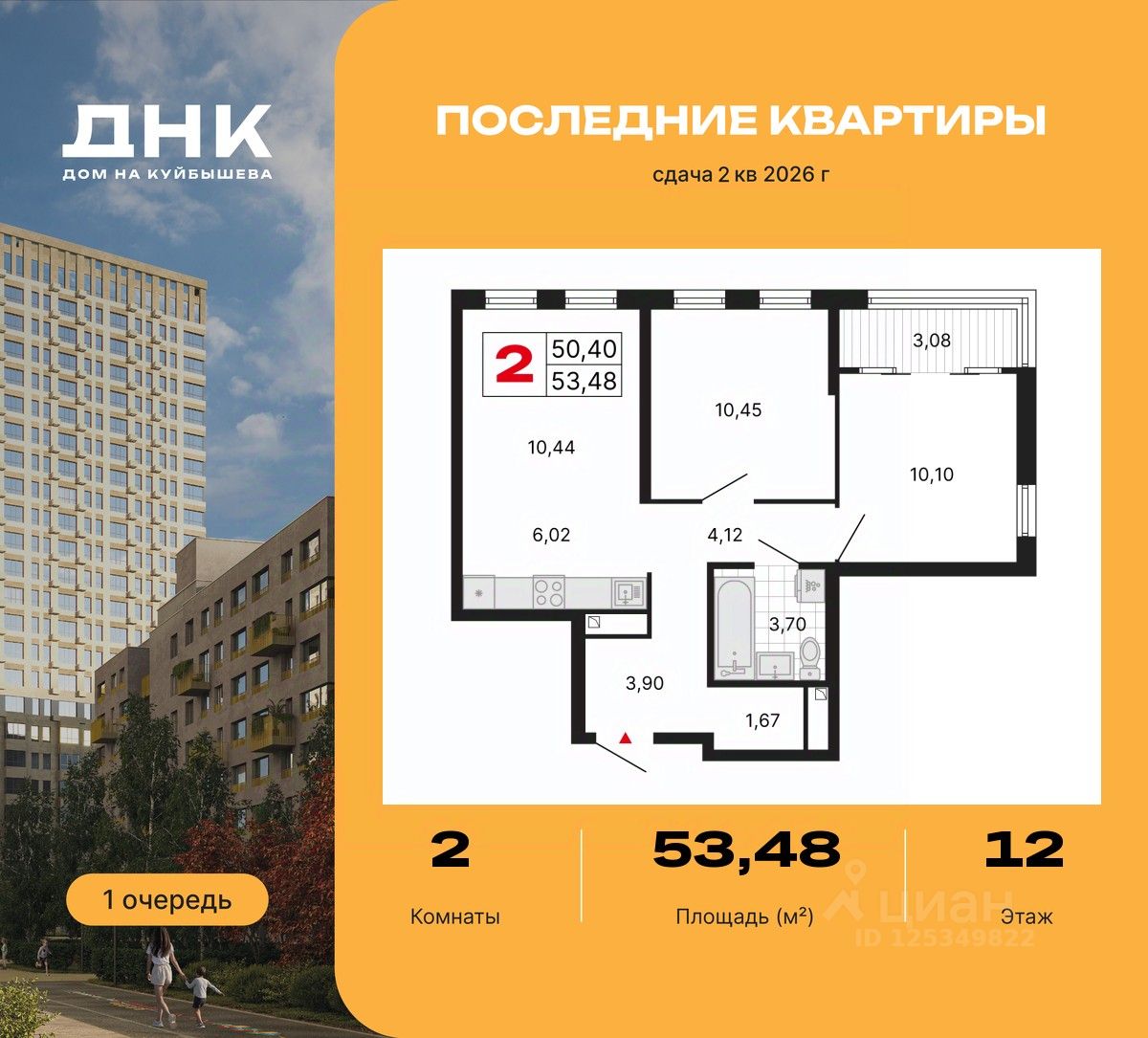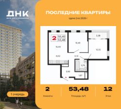Продается 2-комн. квартира с отделкой в ЖК "ДНК. Дом на Куйбышева" на 12 этаже. Общая площадь: 53.48 кв.м., жилая: 20.55 кв.м., площадь просторной кухни-столовой: 16.46 кв.м. Квартира угловая, очень светлая, естественная вентиляция при открытии окон. В квартире одна лоджия, один совмещенный санузел. Высота потолков 2.7 м.