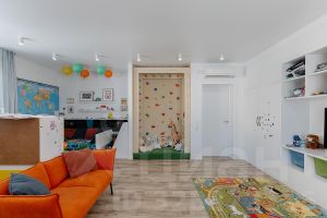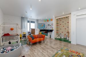 Продумано всё до деталей: в санузлах теплые полы, грамотное расположение розеток, скрытые выводы под гирлянды на окнах, коммуникации под охранную систему, детские замки на окнах. Сделана усиленная шумоизоляция между комнатами, что обеспечивает тишину и приватность.