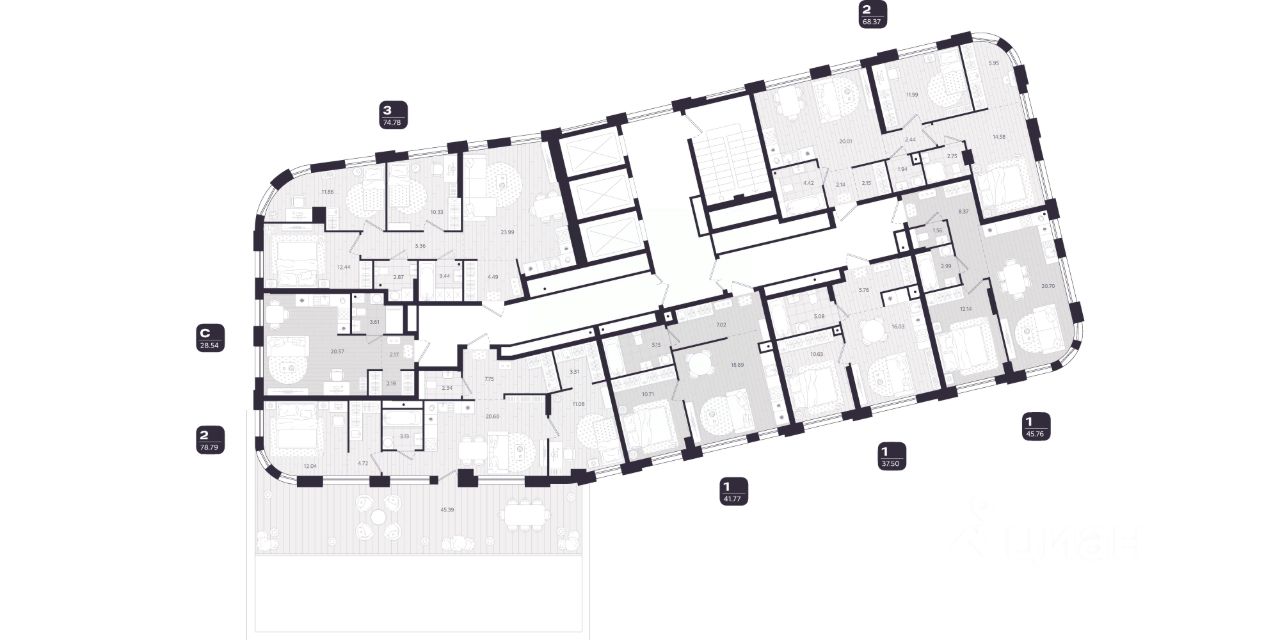 В доме представлено 272 квартиры, от 2 до 9 на этаже, с предчистовой отделкой. Девелопер предлагает более 30 вариантов планировок с гардеробными, просторными санузлами и окнами на 2 стороны.
