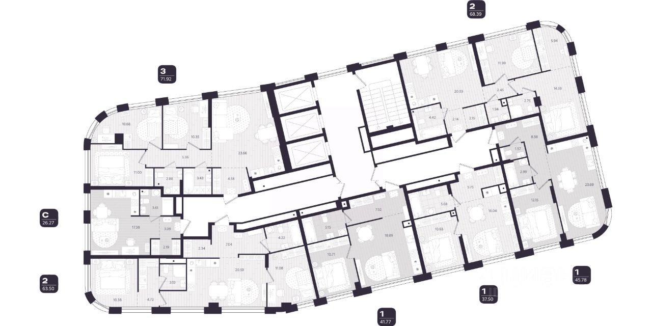 В доме представлено 272 квартиры, от 2 до 9 на этаже, с предчистовой отделкой. Девелопер предлагает более 30 вариантов планировок с гардеробными, просторными санузлами и окнами на 2 стороны.