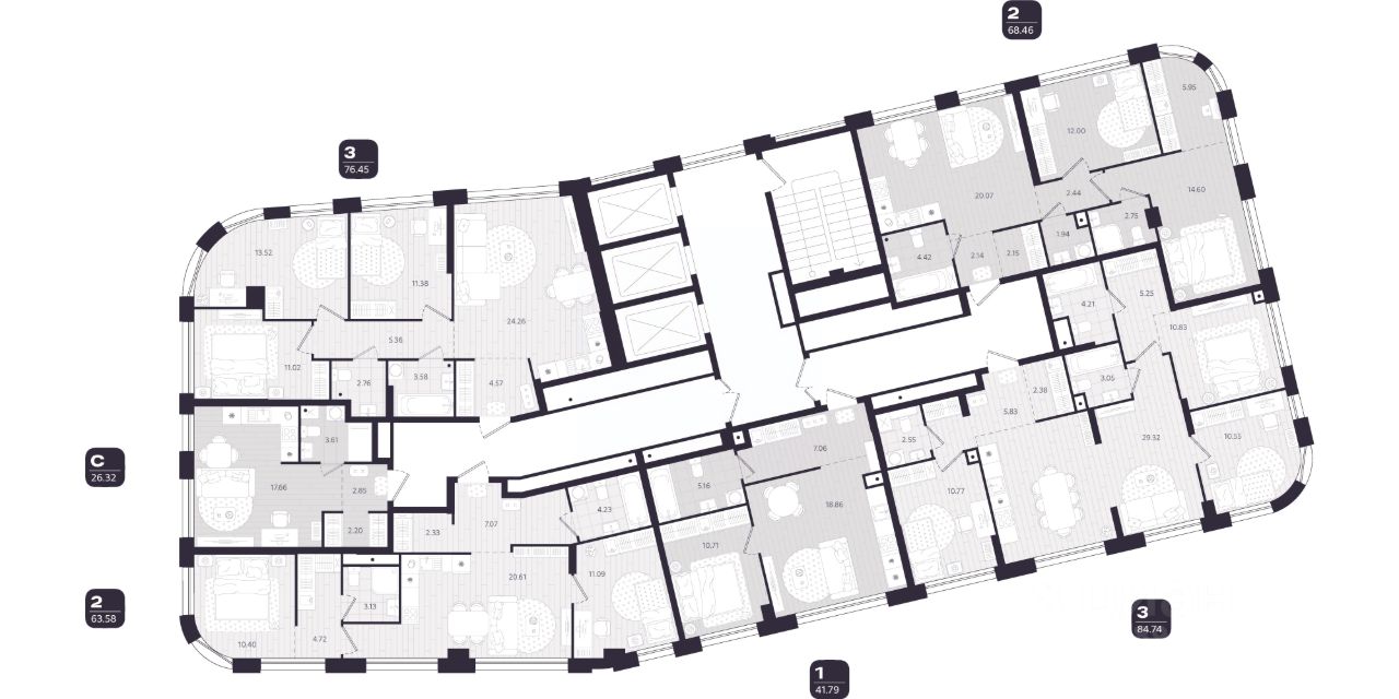 В доме представлено 272 квартиры, от 2 до 9 на этаже, с предчистовой отделкой. Девелопер предлагает более 30 вариантов планировок с гардеробными, просторными санузлами и окнами на 2 стороны.
