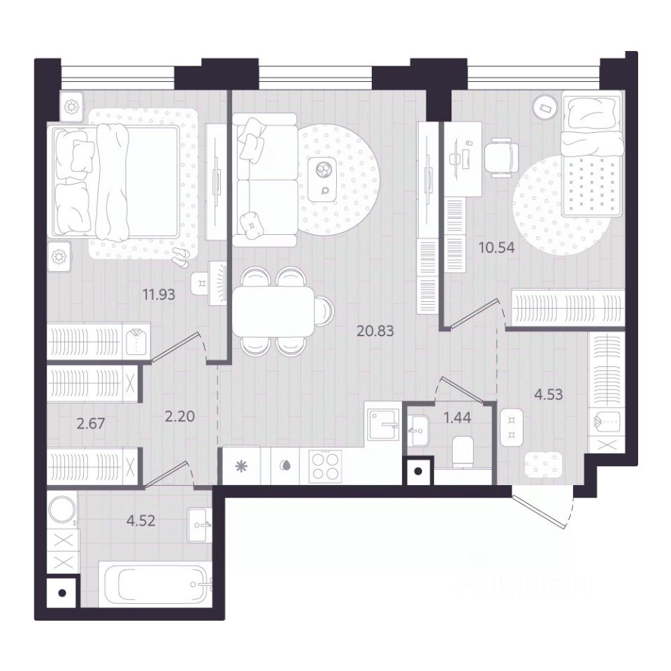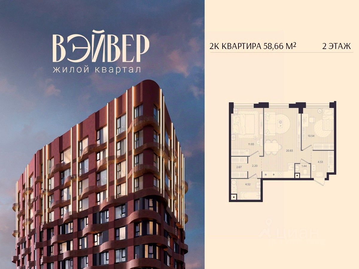 Открыты продажи 2-комнатной квартиры в Жилом квартале Вэйвер от Девелоперской компании Люди, общей площадью 58.66 кв.м., на 2 этаже, по адресу: г. Екатеринбург, улица Восточная. Срок сдачи: IV квартал 2027 года.