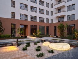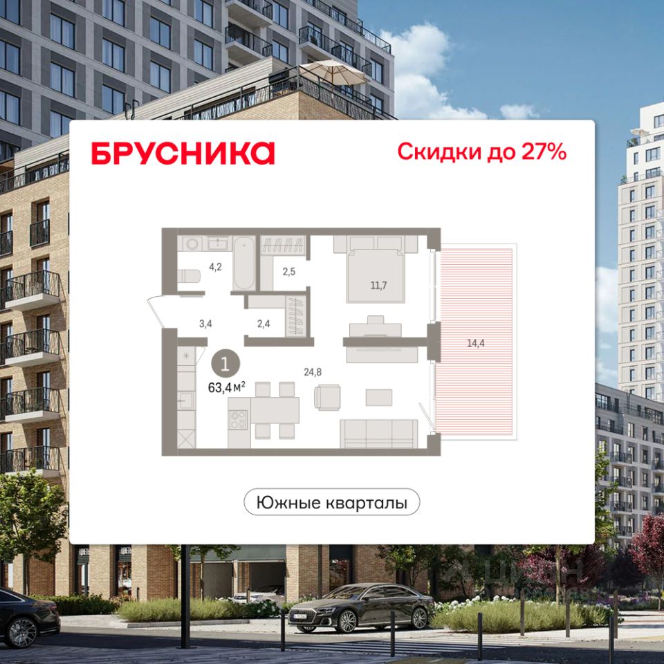 Квартира с кухней-гостиной и одной спальней в Южных кварталах. Особенности планировки: вид во двор, гардеробная, потолки 3 м и выше, предчистовая отделка, терраса.