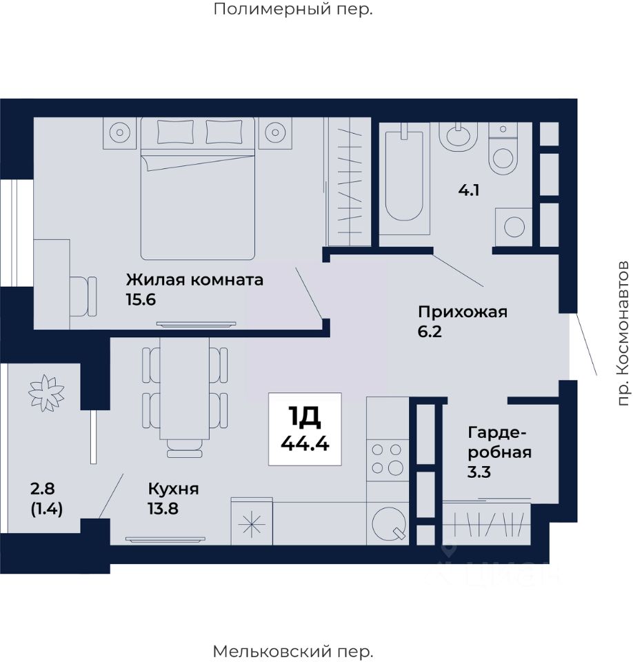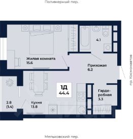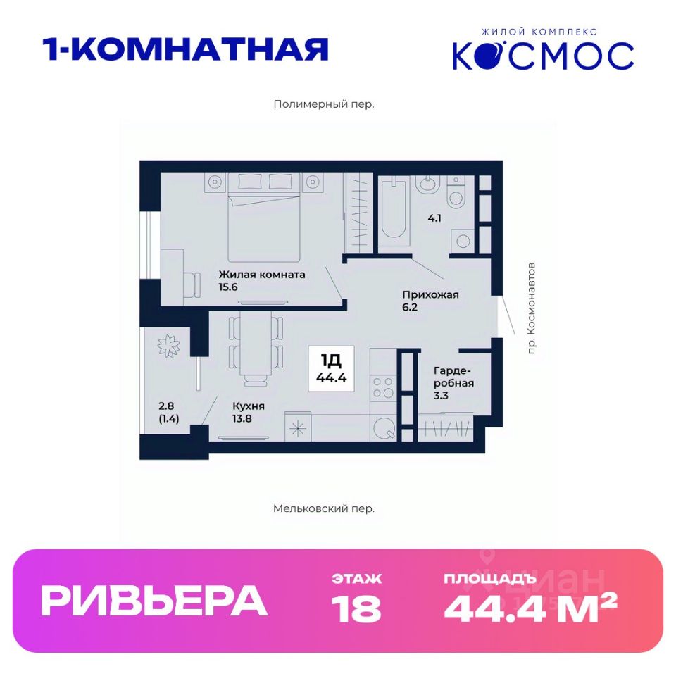 Общая площадь квартиры — 44.4 кв. м, этаж 18 из 31.
