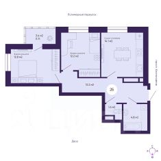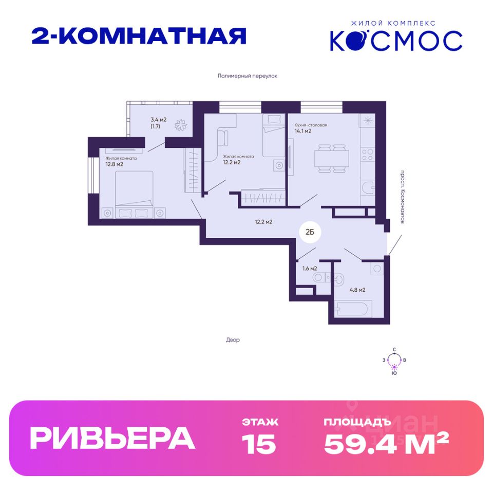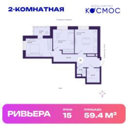 Общая площадь квартиры — 59.4 кв. м, этаж 15 из 19.