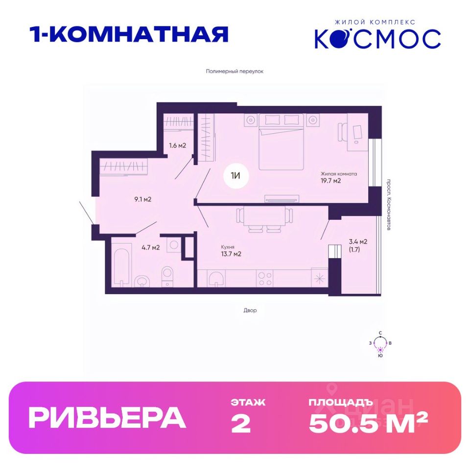 Общая площадь квартиры — 50.5 кв. м, этаж 2 из 19.