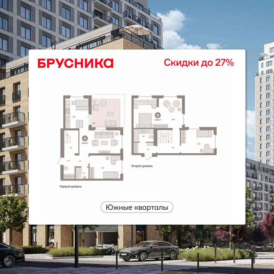 Двухуровневая квартира с кухней-гостиной и тремя спальнями в Южных кварталах. Особенности планировки: второй санузел, гардеробная, двухуровневая, окна в пол, предчистовая отделка, разнесённые спальни, терраса на крыше.