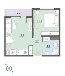 Жилая площадь 11.2 м2, кухня 15.8 м2, отделка под ключ. Раздельных санузлов - нет, балконов - нет, лоджий - 1.