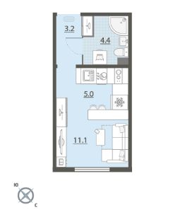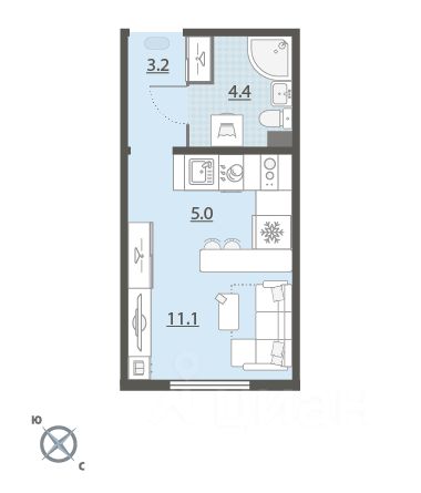 Жилая площадь 11.1 м2, кухня 5 м2, отделка под ключ. Раздельных санузлов - нет, балконов - нет, лоджий - нет.