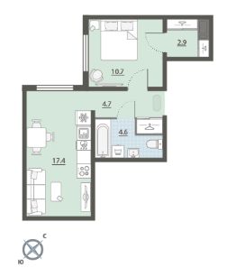 Жилая площадь 10.7 м2, кухня 17.4 м2, отделка под ключ. Раздельных санузлов - нет, балконов - нет, лоджий - нет.
