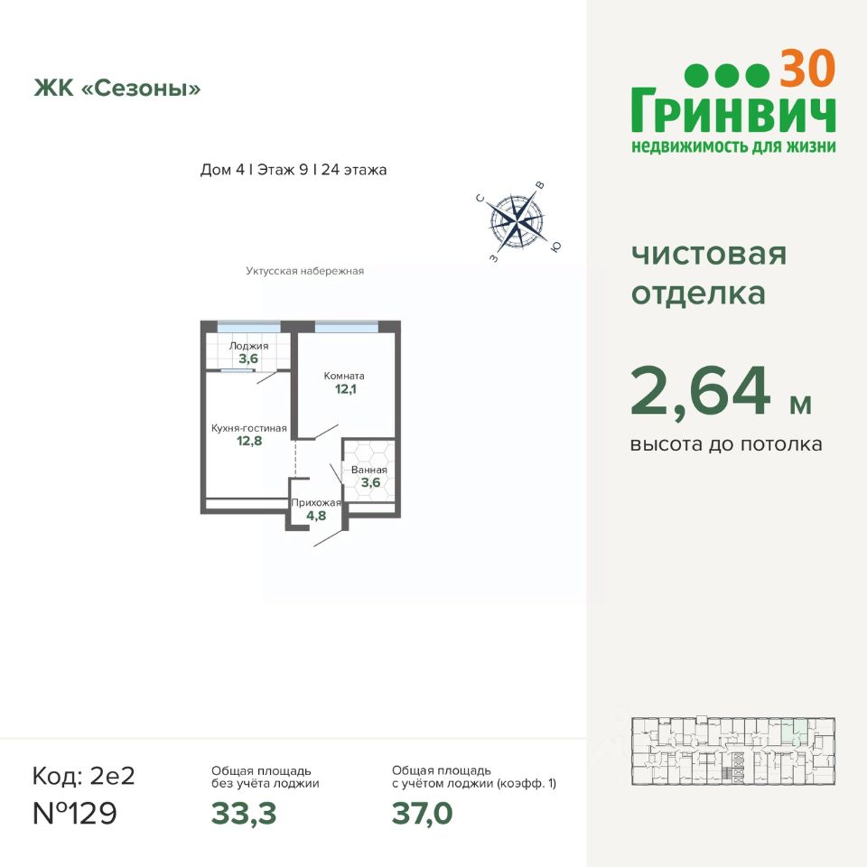 Продаётся 1-комнатная квартира в сданном доме (Щербакова, 82 (Дом 4)), срок сдачи: I-кв. 2026, общей площадью 36.97 кв.м., на 9 этаже. Квартира от застройщика