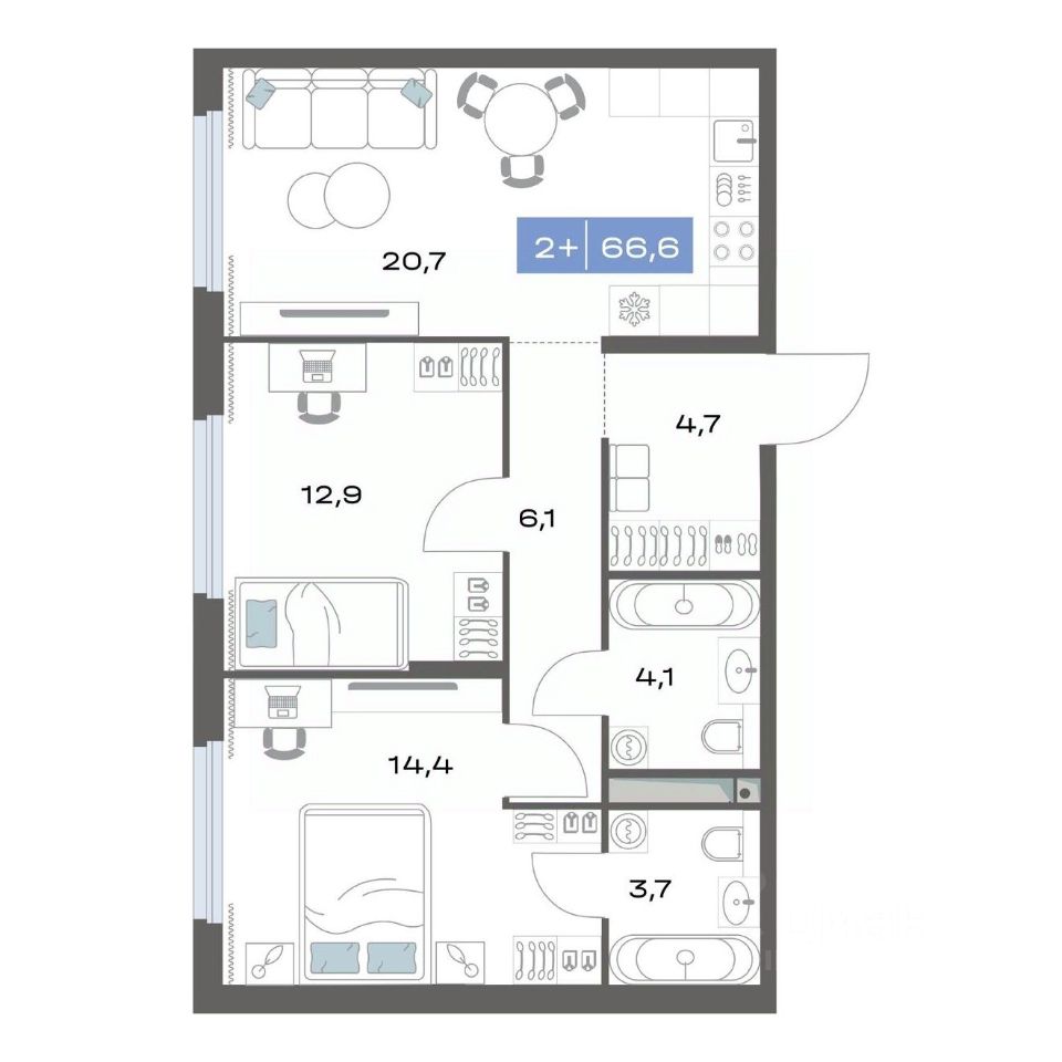Продаётся 2-комнатная квартира в строящемся доме (Корпус 1.4), срок сдачи: III-кв. 2026, общей площадью 66.6 кв.м., на 1 этаже. Новый жилой комплекс "Толк Академический" от застройщика "СЗ Капитан" расположен по адресу: г. Екатеринбург, улица Академика Парина.