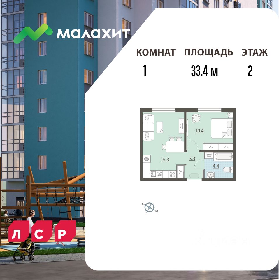 Квартира располагается на 2 этаже 15-этажного дома в ЖК Малахит.