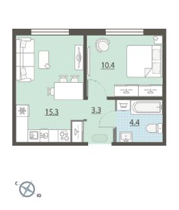 Жилая площадь 10.4 м2, кухня 15.3 м2, чистовая отделка. Раздельных санузлов - нет, балконов - нет, лоджий - нет.