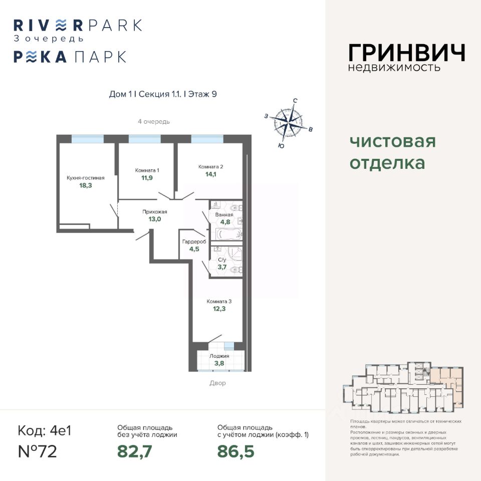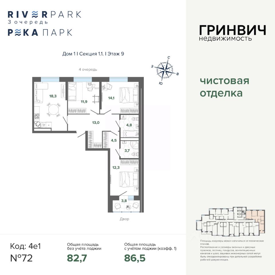 Продаётся 3-комнатная квартира в строящемся доме (3 очередь, Дом 2), срок сдачи: IV-кв. 2026, общей площадью 86.55 кв.м., на 9 этаже. Жилой комплекс "River Park" - новый квартал комфорт-класса с уникальной рекреационной инфраструктурой, собственной набережной, пляжем и парком, расположенный на улице Щербакова, в районе Уктуса, на территории Нижнеисетского пруда.