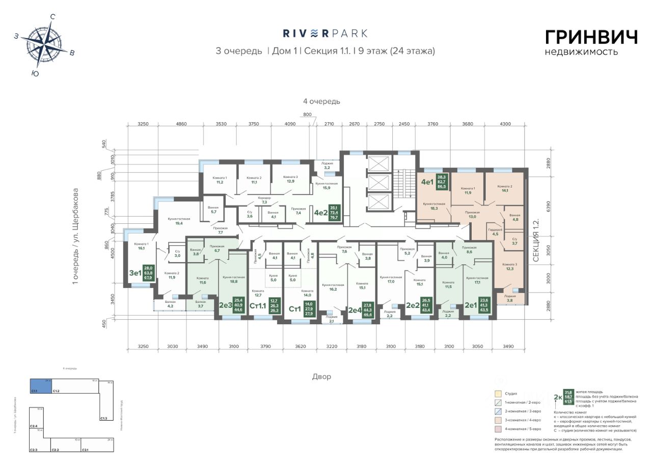 Квартал состоит из 4 очередей. В каждой из них будет собственный закрытый двор на несколько жилых секций переменной этажности. В рамках первой очереди строится первый дом.