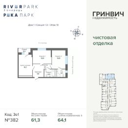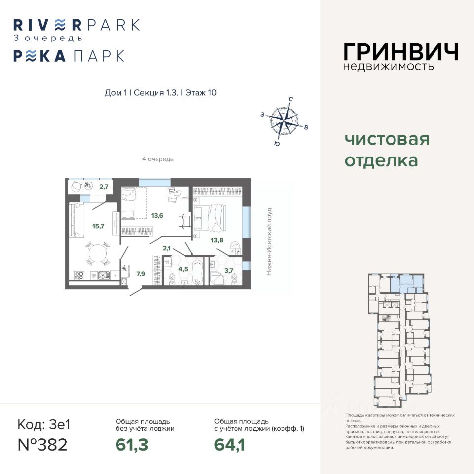 Продаётся 2-комнатная квартира в строящемся доме (3 очередь, Дом 2), срок сдачи: IV-кв. 2026, общей площадью 64.06 кв.м., на 10 этаже. Жилой комплекс "River Park" - новый квартал комфорт-класса с уникальной рекреационной инфраструктурой, собственной набережной, пляжем и парком, расположенный на улице Щербакова, в районе Уктуса, на территории Нижнеисетского пруда.