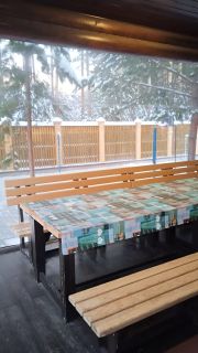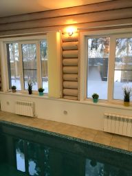 Стильный двухэтажный коттедж класса "Люкс" (ВСЕ ЦЕЛИКОМ - КАК НА ФОТО, с мебелью, техникой и т.д. и т.п.), расположенный в сосновом бору. На первом этаже большая гостиная с мягкой мебелью, из гостиной выход на террасу с барбекю, кухня со встроенной бытовой техникой, баня, бассейн(8м, глубина 2.5м), комната отдыха( с мягкой мебелью , TV , каминный зал с мягкой мебелью. На втором этаже расположены три спальни с двуспальными кроватями, гардеробными шкафами, плазменными телевизорами, спутниковым TV, сан.узлами в одном имеется джакузи, в каждой комнате имеется балкон с плетеной мебелью для отдыха. На участке также расположен дом охраны с видеонаблюдением по периметру