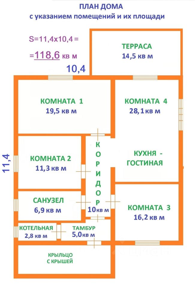 Капитальные и комнатные стены из твин блоков, пол железобетонная армированная плита. В доме 11 помещений: 4 жилых комнаты, кухня, санузел, котельная, теплый тамбур, прихожая с коридором, крыльцо с крышей, холодная кладовая.