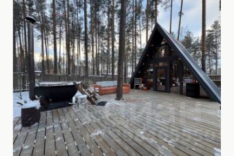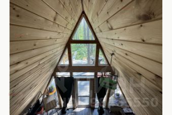 Дом 6х6 метров, построен в современном в стиле А-фрейм (A-frame) по проекту, техническая документация есть. Утепление в два слоя стен и пола - 150 мм. Каркас - доска 150х50. Стеклопакеты 3 камеры с напылением, цвет - бронза. Рама - профиль 5 камер. Влагостойкий ламинат 33 класса. Межкомнатные двери из дерева. Внутри обшит имитацией бруса. Профлист - цвет графит. Установлен на винтовых свая. Для увеличения полезного пространства сделано антресольное спальное место. К дому пристроена терраса 6х6 метров из сосны, обработана антисептиком и покрашена, устойчивой к погодным условиям, краской.