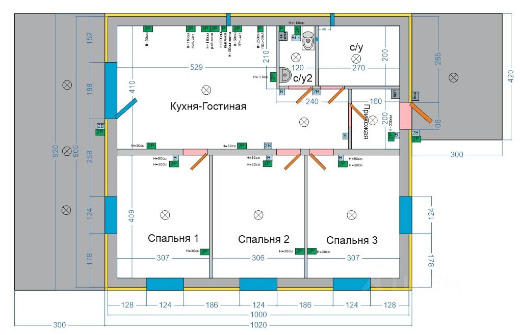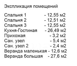 Планировка дома включает в себя три изолированных спальни, санузел с оборудованной котельной, ванная комната, кухня-гостиная с панорамным остеклением и выходом на террасу.