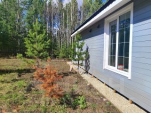 * На территории открытая терраса, зона мангала , выделено отдельное место для костра в будущем можно поставить беседку есть под нее место, высажен газон, проложены тропинки, на участке есть молодые ели и сосны.