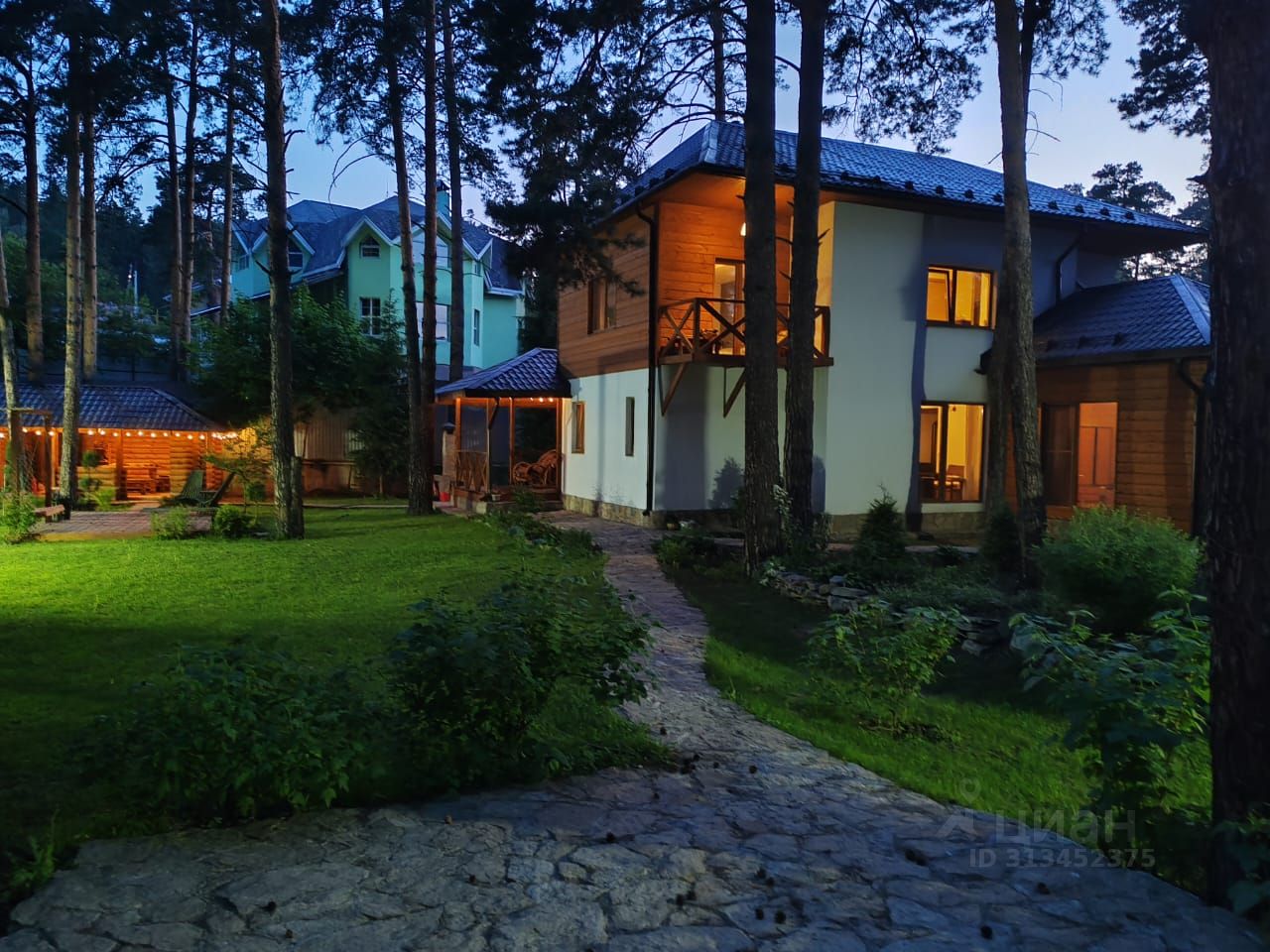Ландшафтный участок, создан таким образом, что является продолжением леса. Дорожки из природного камня, газон, декоративные кустарники и цветы.