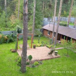 Участок с домом расположен в конце тупиковой улицы из 5 коттеджей. При строительстве всё сосны были сохранены. Пение птиц и созерцание белочек гарантировано.
