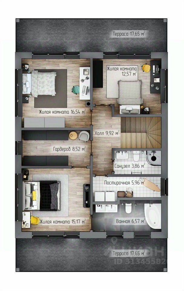 4 спальные комнаты, в т. Ч. Мастер-спальная с санузлом и просторной гардеробной, отделяющей спальную хозяев от других помещений для лучшей шумоизоляции.