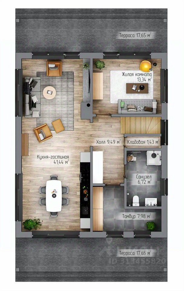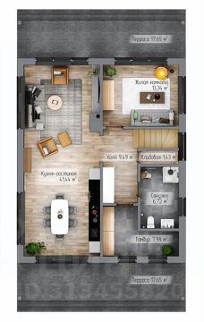 Из всех комнат есть выход на крытые террасы, площадь которых порядка 90 кв. М.
