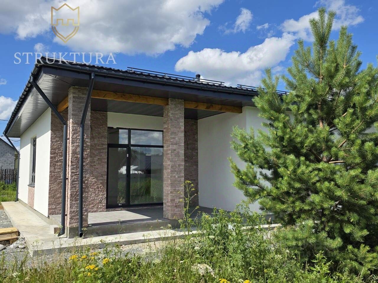 Внутри планировка дома функциональна и эргономична, а предчистовая отделка позволит вам воплотить в жизнь любые дизайнерские идеи. Продуманная планировка обеспечит комфортное проживание вашей семьи: прихожая с зоной для хранения позволит поддерживать порядок, а полностью оборудованная котельная гарантирует удобство и тепло в холодное время года. Ванная комната и отдельный гостевой санузел создадут дополнительный комфорт для вас и ваших гостей. Три спальни обеспечат каждому члену семьи возможность создать свое личное пространство, где можно расслабиться и восстановить силы. Просторная кухня-гостиная с панорамными окнами, которая наполняет дом светом и бетонная терраса, расположенная под единой крышей дома. На террасе уместится летняя мебель, где вы сможете наслаждаться свежим воздухом и видами на свой участок.