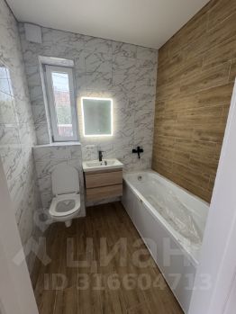 В ванной комнате сделан ремонт: керамогранит, установлена вся сантехника (подвесная тумба с раковиной, зеркало с подсветкой, акриловая ванна, смесители, инсталляция, левая стена теплая - смонтирован на стену электрический теплый кабель, что заменит полотенцесушитель, установлен бесшумный вытяжной электровентилятор).