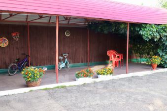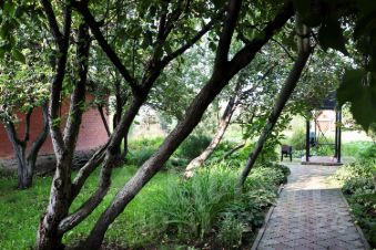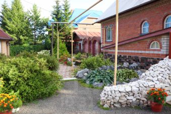 Зона отдыха: закрытая беседка с мангалом, качели, цветники