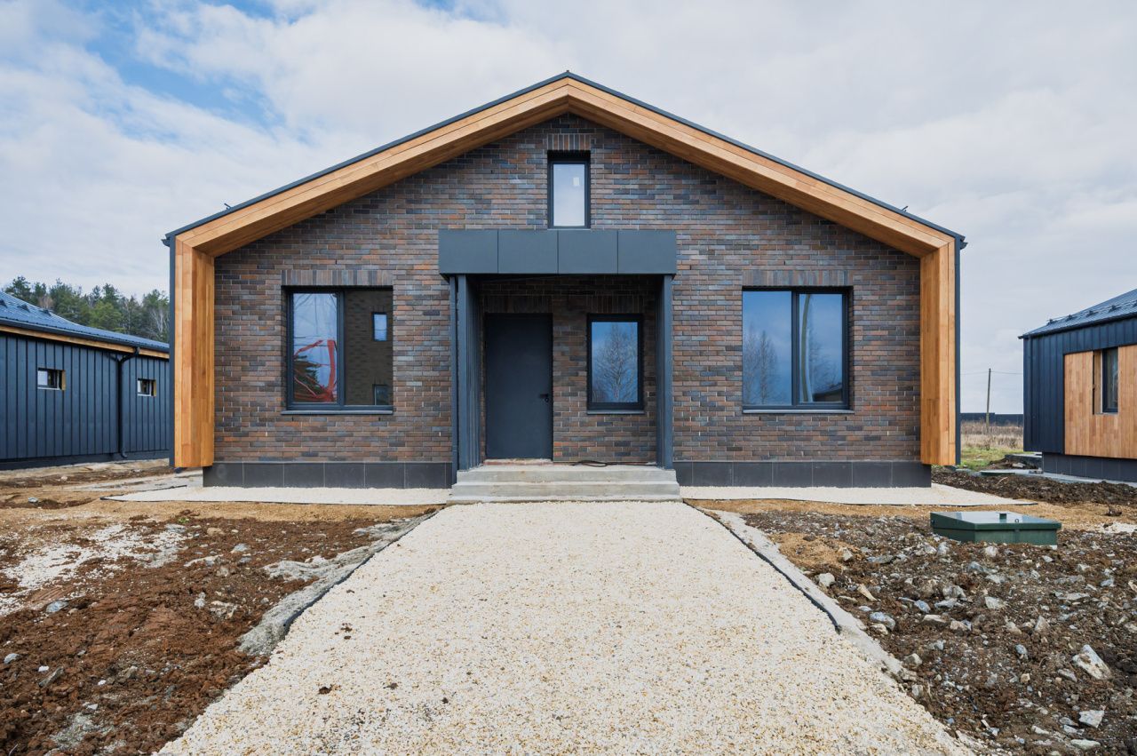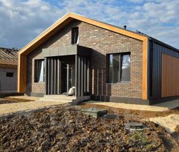Фасад: Вентилируемый. Комбинированные материалы (кирпич, планкен лиственницы класса Экстра, профнастил с имитацией фальца)