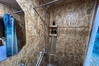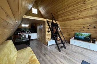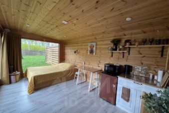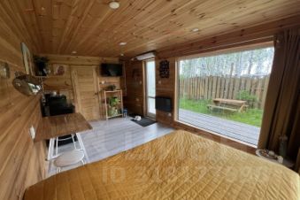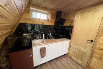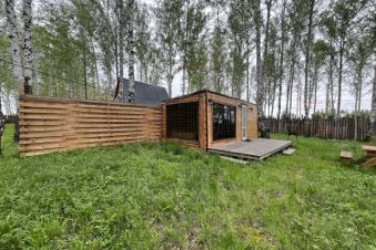 Второй дом - каркасный деревянный с панорамными окнами, площадью 18 кв.м. (3×6 м), построен в 2023 году. Электричество, вода (та же скважина). Санузел, душ канализация, водонагреватель, обогреватель, тёплый пол. Двуспальная кровать, обеденный стол, стулья, холодильник, СВЧ, кухонный стол.
