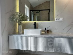 — Санузел премиум-уровня: душ без порога, плитка с запилами 45", стильная мебель