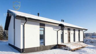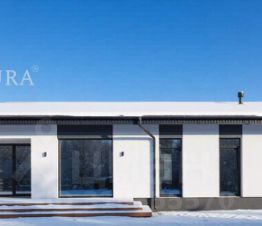 Фасад здания выполнен в контрастной отделке штукатуркой белого и серого цветов. Такой фасад не только красив, но и практичен. Он защитит ваши стены от атмосферных осадков и перепада температур, прослужит вам долгие годы без дополнительных затрат на обслуживание. Панорамные окна серого цвета и кровля покрытая волнистой металлочерепицей дополняют внешний облик здания. Крыльцо под общей крышей защитит вас от осадков и даже позволит уместить коляску или детский велосипед.