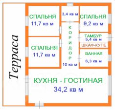 - гостиная с кухонной зоной и 2-мя выходами во двор и на террасу