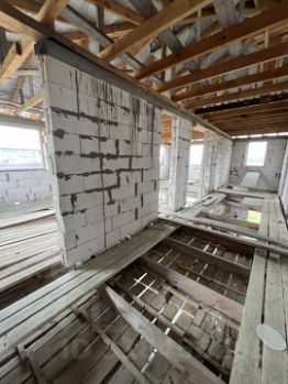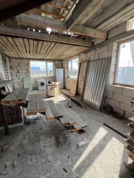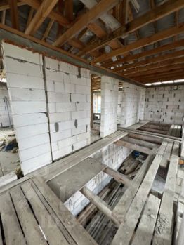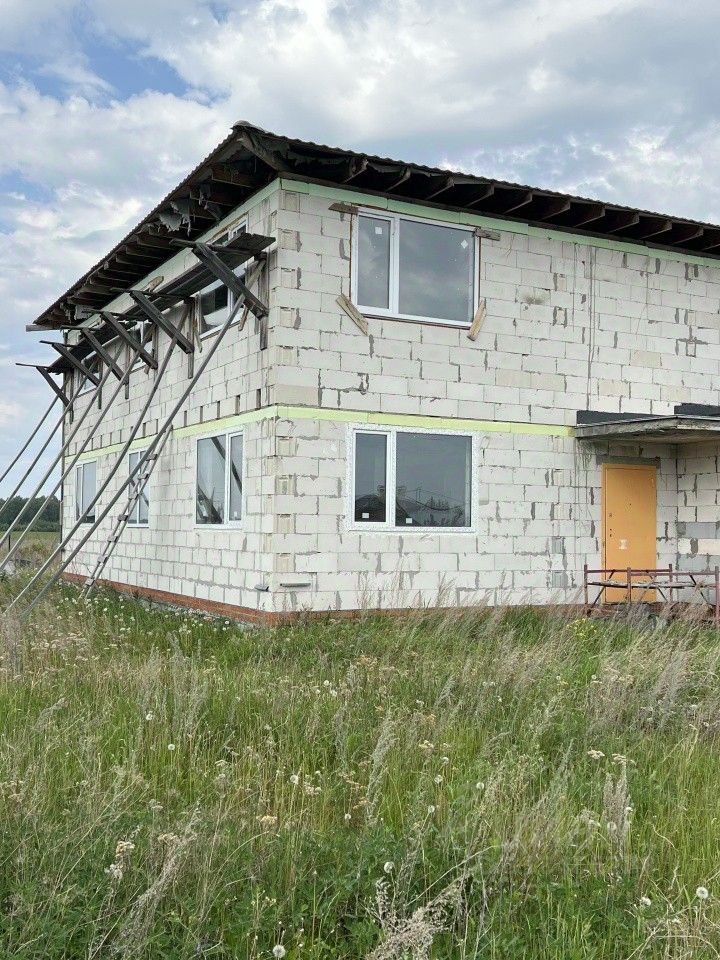 Дом площадью 250 кв. м. ,2 этажа. 13*13, материал стен - газоблоки 300, фундамент ленточно-свайный, сваи 2,5 метра. Крыша - металлочерепица, окна остеклены.