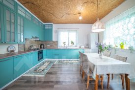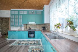 Кухня с современным дорогим кухонным гарнитуром.
