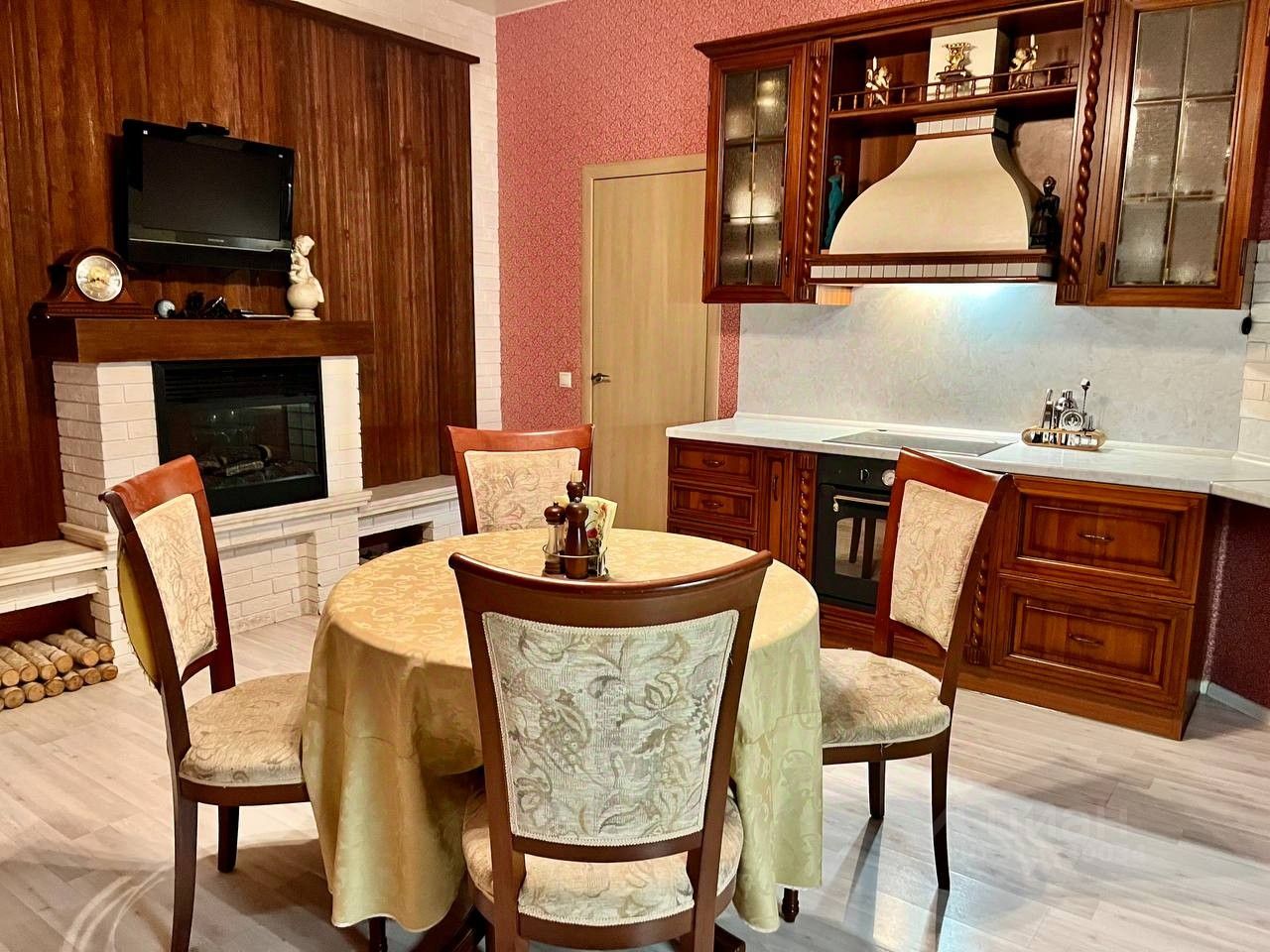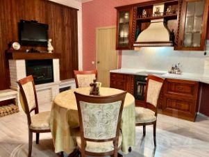 Функциональная кухня-столовая 24 м² с камином — идеальное место для уютных семейных вечеров. Установлен качественный итальянский кухонный гарнитур из массива дерева.