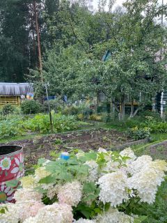 Участок отличается развитой инфраструктурой: плодоносящие яблони, кусты смородины, крыжовника, жимолости, черевишни, черноплодной рябины, а также грядки с клубникой и декоративными многолетними растениями, включая гортензии. Удобная транспортная доступность обеспечивается близостью остановки "Садоводы", а подъезд к участку возможен как со стороны леса, так и с организованной стоянки для автомобиля.