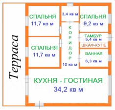 - гостиная с кухонной зоной и 2-мя выходами во двор и на террасу