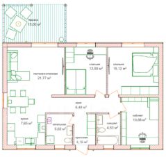 Внутри дома, два санузла — с различным функционалом, целых три спальни, гостям не будет тесно в вашем доме! Впрочем, внутреннюю архитектуру можно легко поменять по своему желанию.
