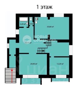 На 1-м этаже: холл, сан. узел, две спальни, кухня 20м2 ( высота потолков в кухне 4 м)