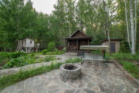 На территории гараж на два автомобиля, детский домик, зона отдыха, баня.