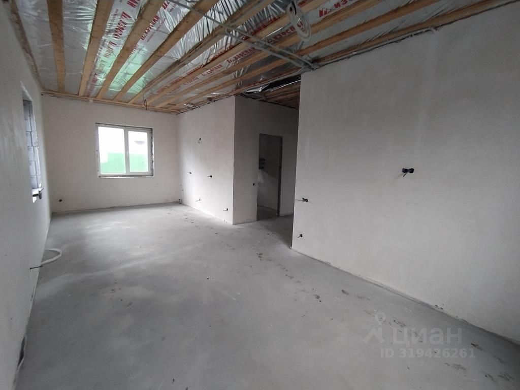 Дом с отделкой под чистовую, на полу полусухая стяжка с утеплением 50мм, стены оштукатурены.