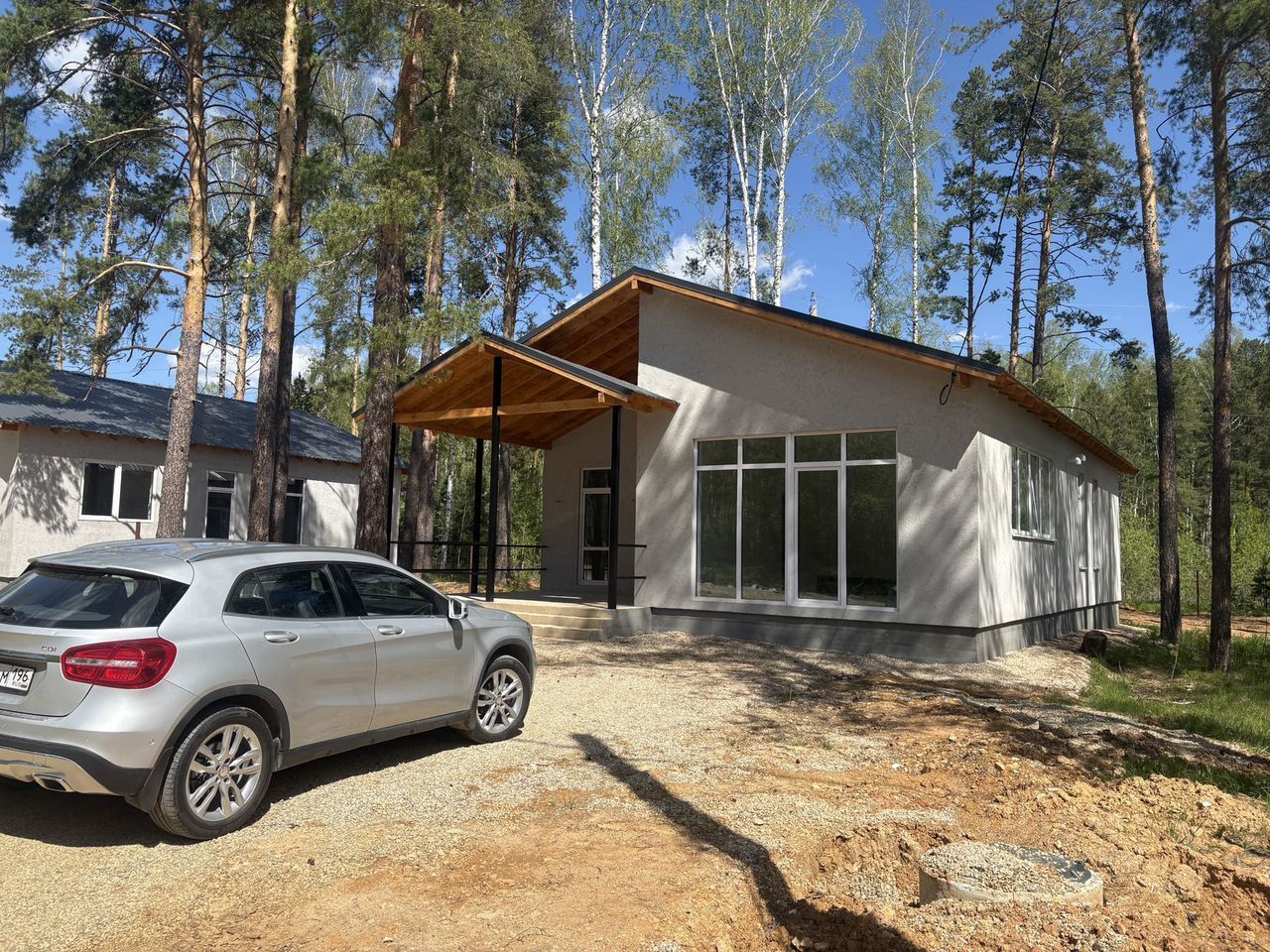 В ДОМЕ просторная кухня-гостиная с панорамными окнами, три спальные комнаты, санузел, котельная, терраса. По периметру участка установлены столбики под забор. От Екатеринбурга 35 км по Тюменскому тракту.