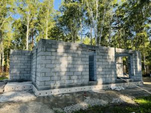 Стены из твин-блока на фундаменте по современному дизайн-проекту, отвечающему эргономике пространства, залитый армопояс под крышу, стильный кирпичный забор с деревянными вставками.