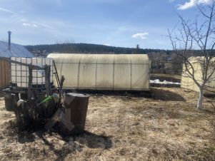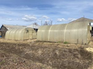 На участке расположены 2 добротных теплицы, крытая веранда, грядки, земля плодородная, разработанная, сам участок ровный. Растет яблоня, жимолость.